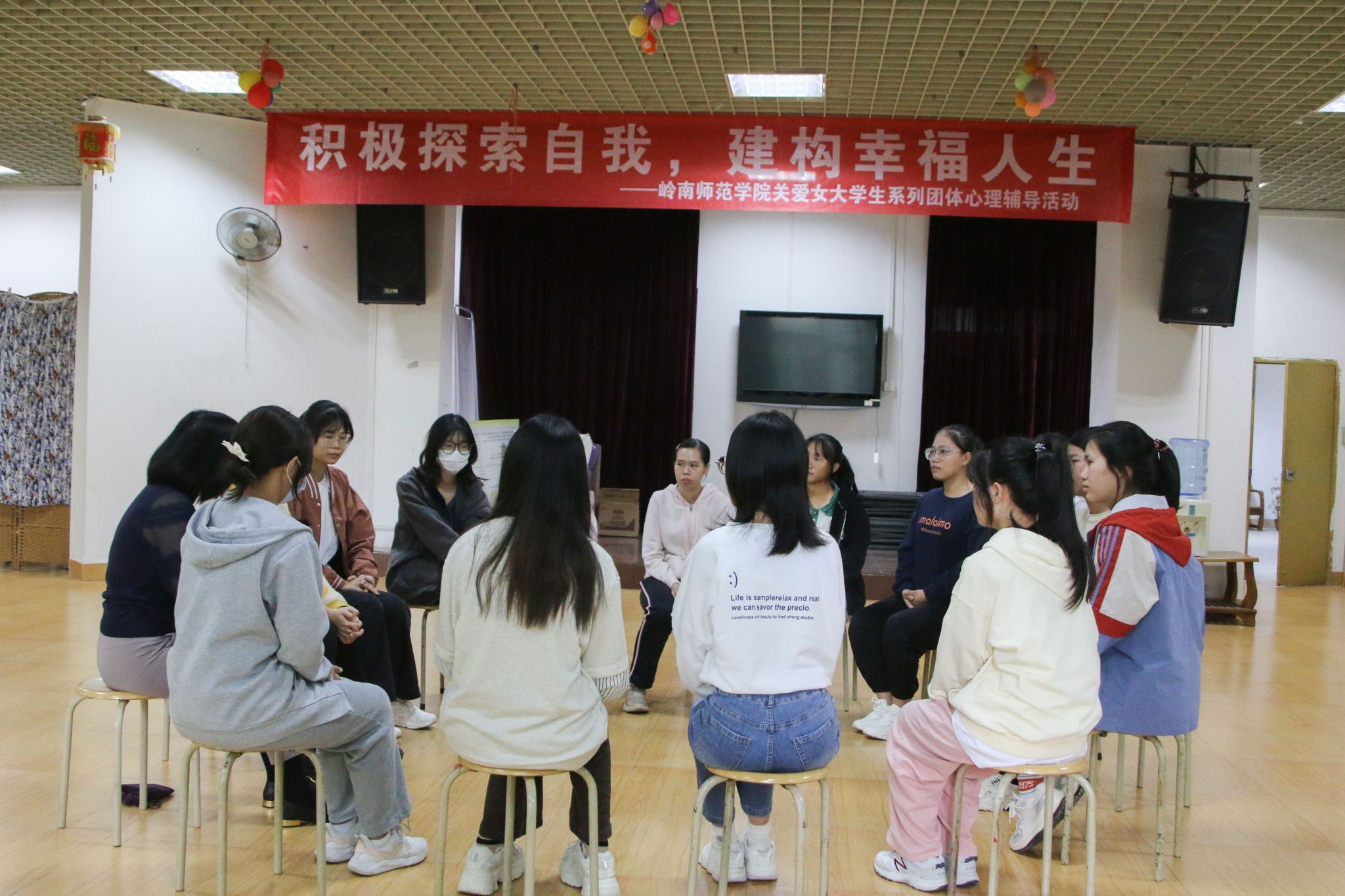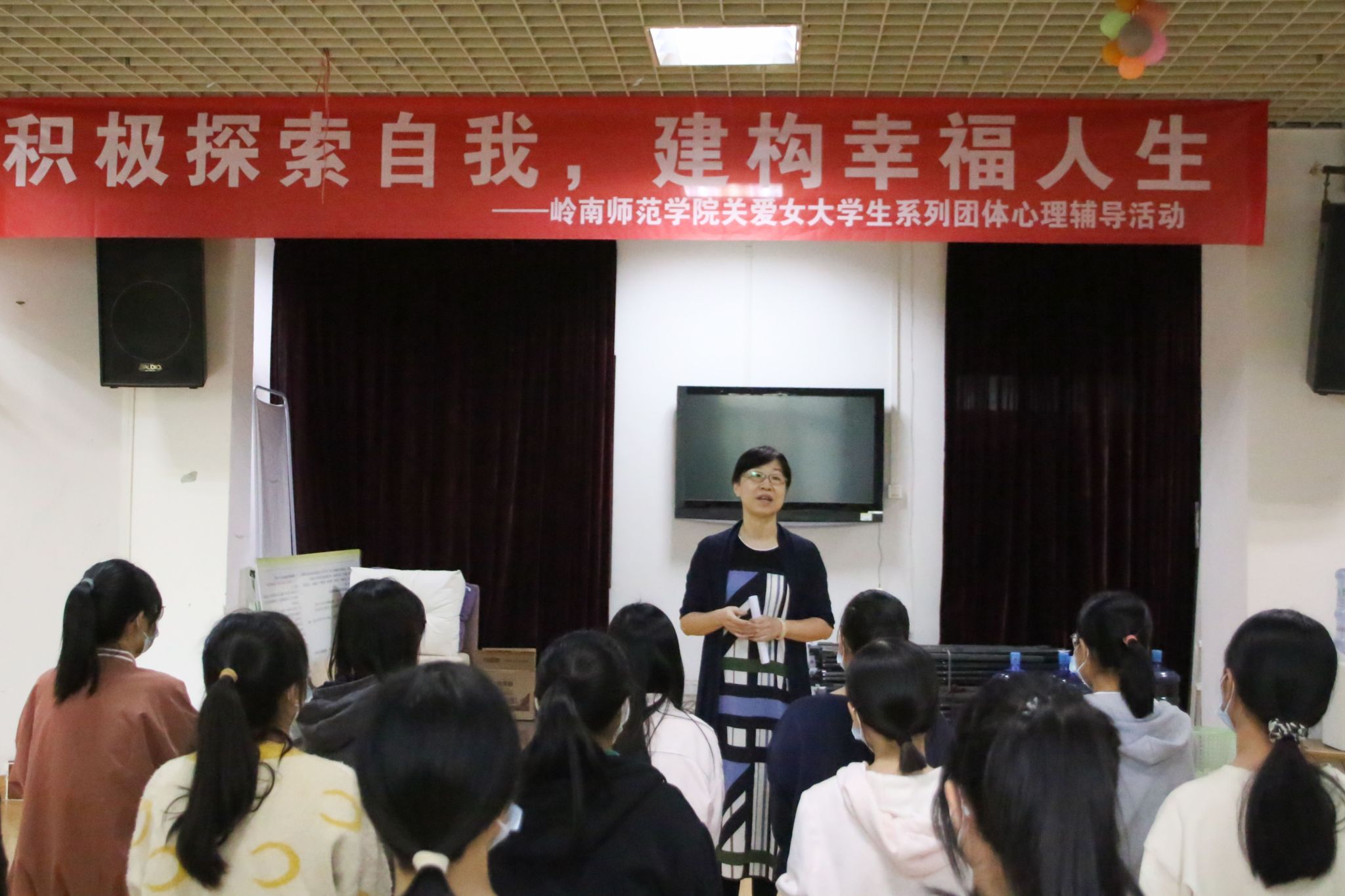 岭师新闻中心讯:10月20日下午,学校工会女工委在燕岭阁二楼离退办活动中心举办岭南师范学院关爱女大学生系列团体心理辅导活动。活动以“积极探索自我,建构幸福人生”为主题,旨在引导女大学生对自我概念的深入探索与体验,激发其对职业生涯的关注与思考。学校工会常务副主席林艳萍出席活动并讲话。