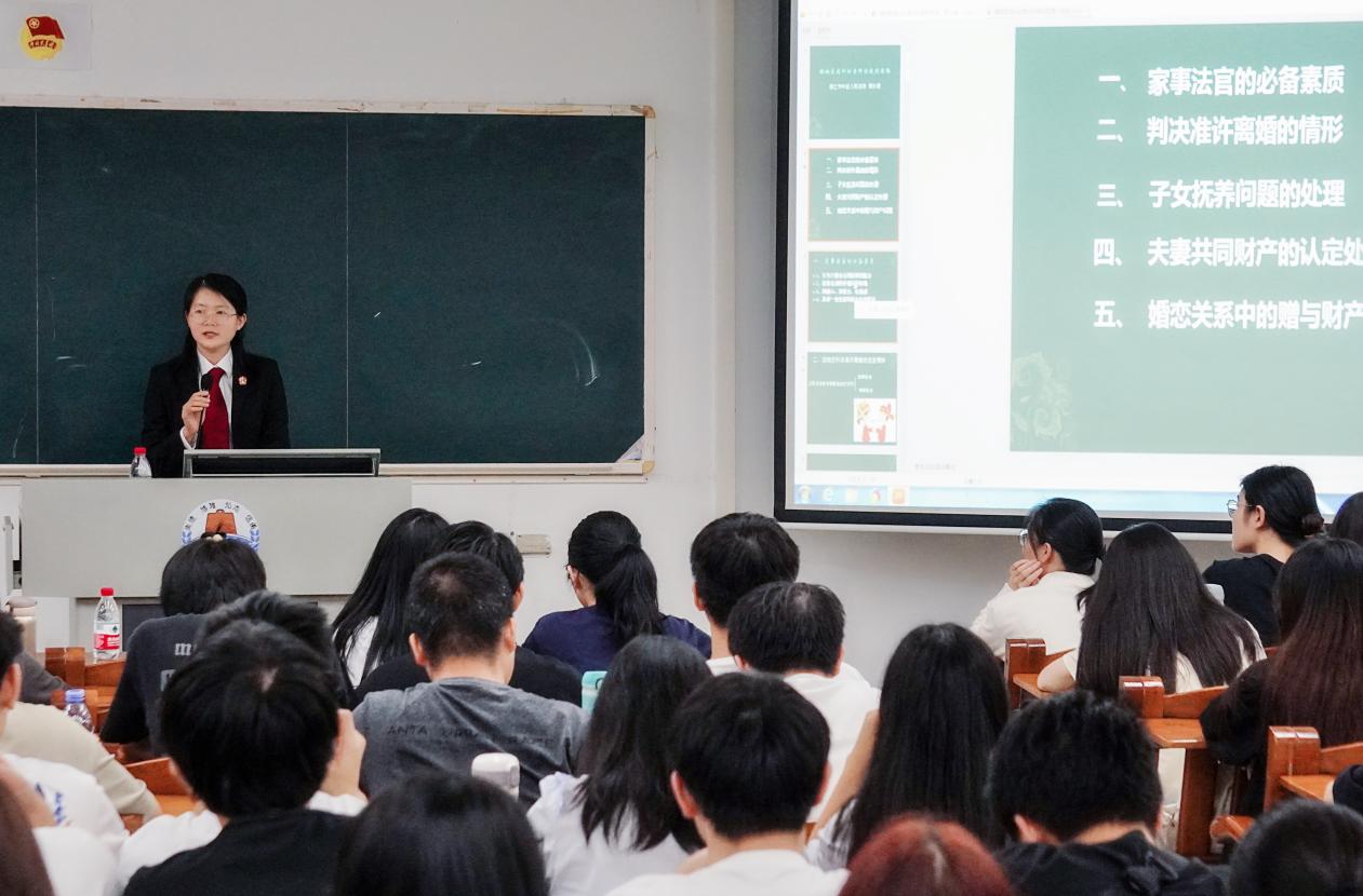 韦志明首先对周冰清的到来表示热烈欢迎。他表示,周法官分享自己在家事审判多年工作中的经验与体会,以及家事裁判的独特思路与方法,希望同学们能够认真学习,从中获得收益与启发。同时,也表示未来法学系将会举办更多的法学实践课程讲座,以此推进高素质应用型法律职业人才的培养。陈红桔表示,家事裁判中存在着情、理、法交融的问题,不仅要以法服人,更存在情理发挥作用的巨大空间,这是家事裁判与普通民事诉讼的区别,充分体现了家事审判法官的艰辛与不易,希望同学们认真学习周法官讲授的审判案例工作,努力成长为优秀法学专业人才。