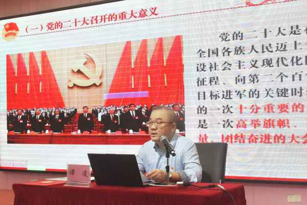 “党的二十大报告作为奋进新时代新征程的政治宣言和行动纲领,集中体现在大会的主题中,体现在大会主题确定的新时代新征程的中心任务中。”谭凌从党的二十大主题的历史背景和根据、科学内涵等方面带领同学们理解大会主题和大会确定的中心任务,指出要把党的二十大提出的新时代新征程的行动纲领和中心任务变为现实,就必须坚持五项重大原则和牢记“五个必由之路”。他号召广大青年应始终坚信,有以习近平同志为核心的党中央坚强领导,有习近平新时代中国特色社会主义思想科学指导,有党的二十大精神正确引领,中国特色社会主义的巍巍巨轮就一定能胜利驶向成功的彼岸。