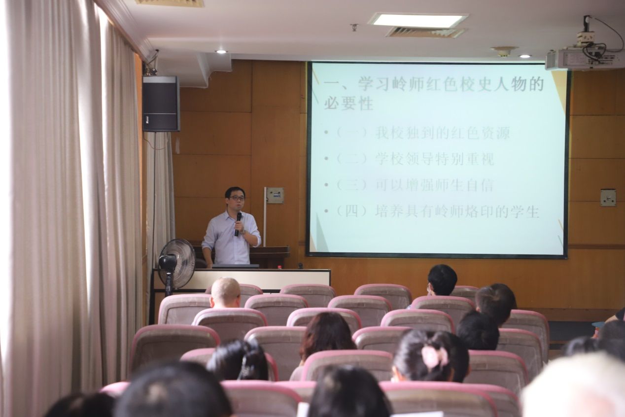 夏松涛的宣讲围绕学习岭师红色校史人物的必要性、红色校史人物的先进事迹、精神品质、学习红色校史人物的提议与建议等四个方面展开。其中重点介绍了黄学增、谭平山等六位革命先辈的先进事迹,讲解了他们高尚的精神品质,并号召大家向革命先辈学习,坚定自己的革命信仰,培养强烈的爱国主义,主动学习。除了介绍惊心动魄的革命史外,夏松涛还提到了革命先辈一些有趣的生活细节,与会者不时发出会心一笑,讲座气氛轻松而热烈,收到了良好的效果。