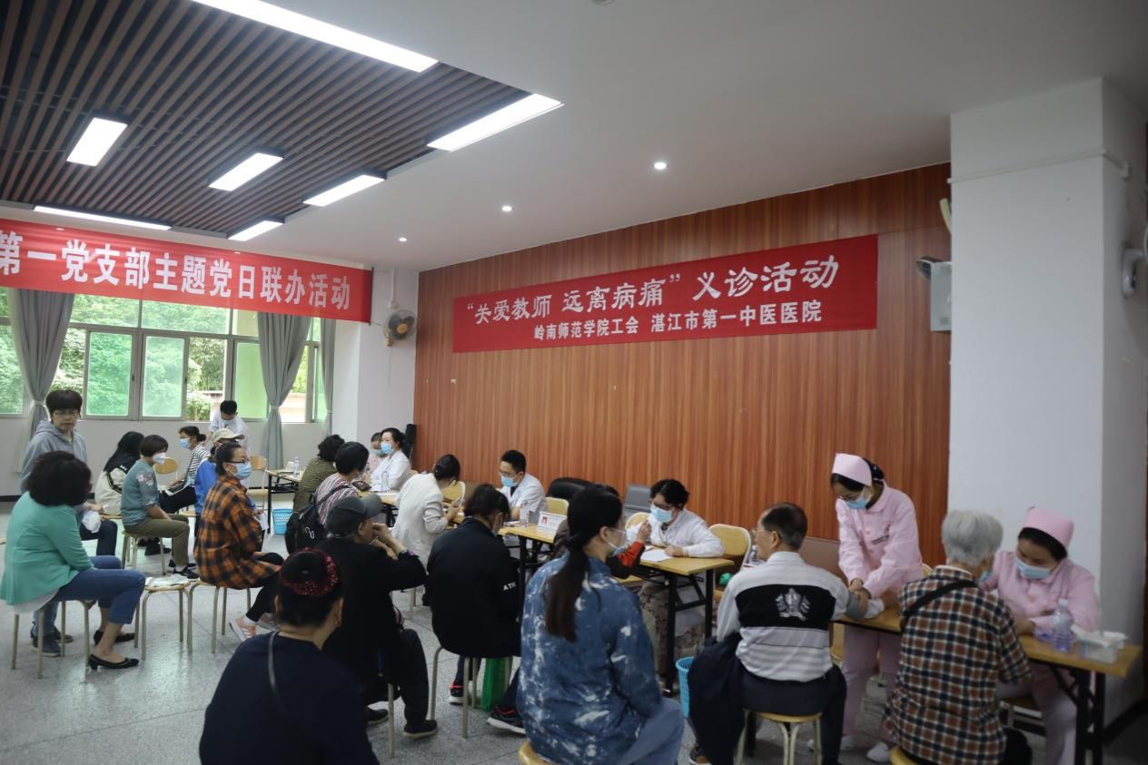 岭师新闻中心讯:为落实机关党委“百联树人、支部共建”行动,扎实推进“我为师生办实事”走深走实,为师生员工提供更为专业、优质的医疗保健服务,进一步提升广大师生员工幸福感、归属感和满意度,4月26日上午,工会党支部与湛江市第一中医医院行政第一党支部于学校燕岭阁工会活动室联合开展“关爱教师 远离病痛”义诊主题党员活动。