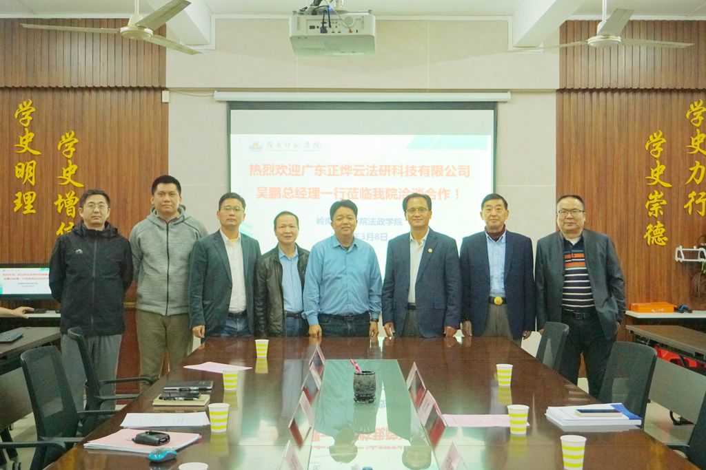 为深入推进访企拓岗促就业专项行动,全力拓宽毕业生就业渠道,促进毕业生更加充分更高质量就业,积极推进产教融合协同育人高质量发展,3月8日,法政学院在弘雷楼313室与广东正烨云法研科技有限公司总经理吴鹏、副总经理朱涛、郑海彪一行进行合作洽谈。法政学院党委书记李德深、法政学院院长刘鑫淼、法政学院党委副书记易贤、法政学院法学系系主任孟庆吉、校网络与信息技术中心软件运维部主任陈建锐、法政学院辅导员赵欢参加本次洽谈活动。