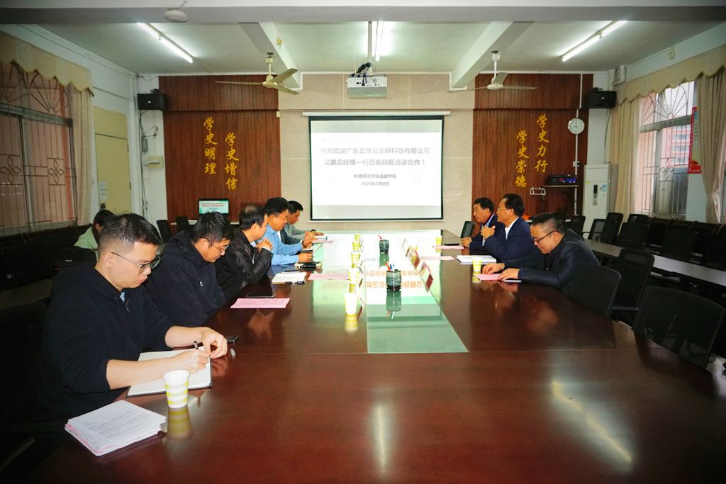 会上,李德深对吴鹏一行的到来表示热烈欢迎,他强调希望通过加强校企双方合作,以“合作共赢”为切入点,积极搭建校企合作交流平台,形成校企联合、产教融合的人才培养模式,着力打造校企资源共享、优势互补、人才共育新局面。李德深详细介绍了法政学院法学专业学生实习就业等情况,表示非常期待与广东正烨云法研科技有限公司在人才培养和学生实习就业等方面进行交流合作,特别是在法学专业实训室共建方面进行深度合作,提升法政学院的教学水平和学生就业质量。