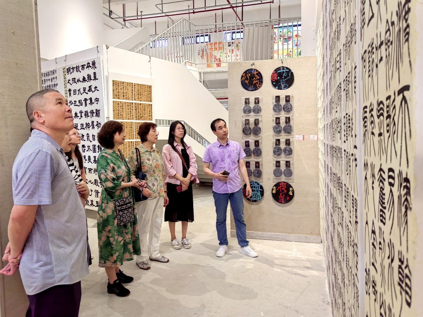 学员们驻足在每一幅作品前,仔细品味着学生们的创作灵感和艺术魅力,不时发出赞叹和感慨。书法班老师刘华敏也耐心地为学员们讲解作品,向大家普及中国书法和各类字体在各个不同历史阶段的风格特点和演变过程等。