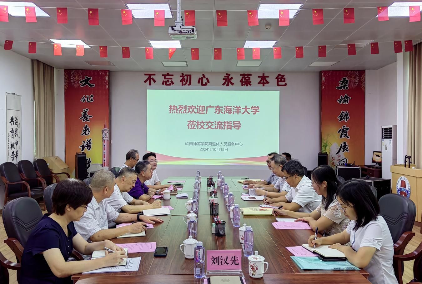 10月15日下午,广东海洋大学关心下一代工作委员会主任、原党委副书记彭权群率队一行6人莅临学校离退休人员服务中心座谈交流,就如何推动新时代关工委工作和离退休工作高质量发展深入交换意见。会议由离退休人员服务中心党委书记、主任欧海清主持。