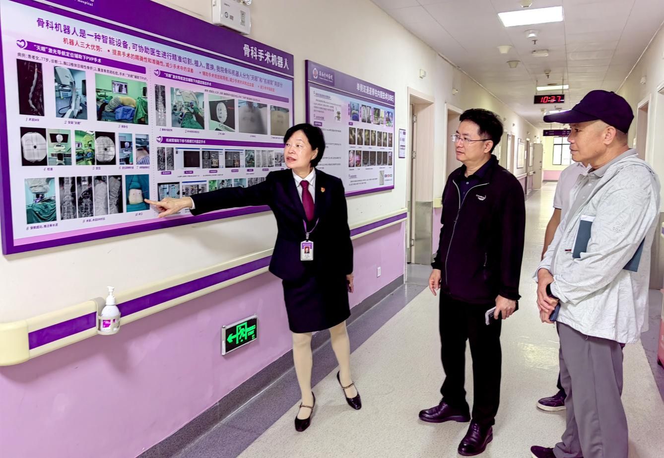 欧海清一行在岭南骨科医院副院长朱明的陪同下,实地参观调研了该院的AI机器人功能康复中心、VIP室、骨内区、脊柱骨科和门诊大厅等场所。朱明简要介绍了岭南骨科医院的基本情况。