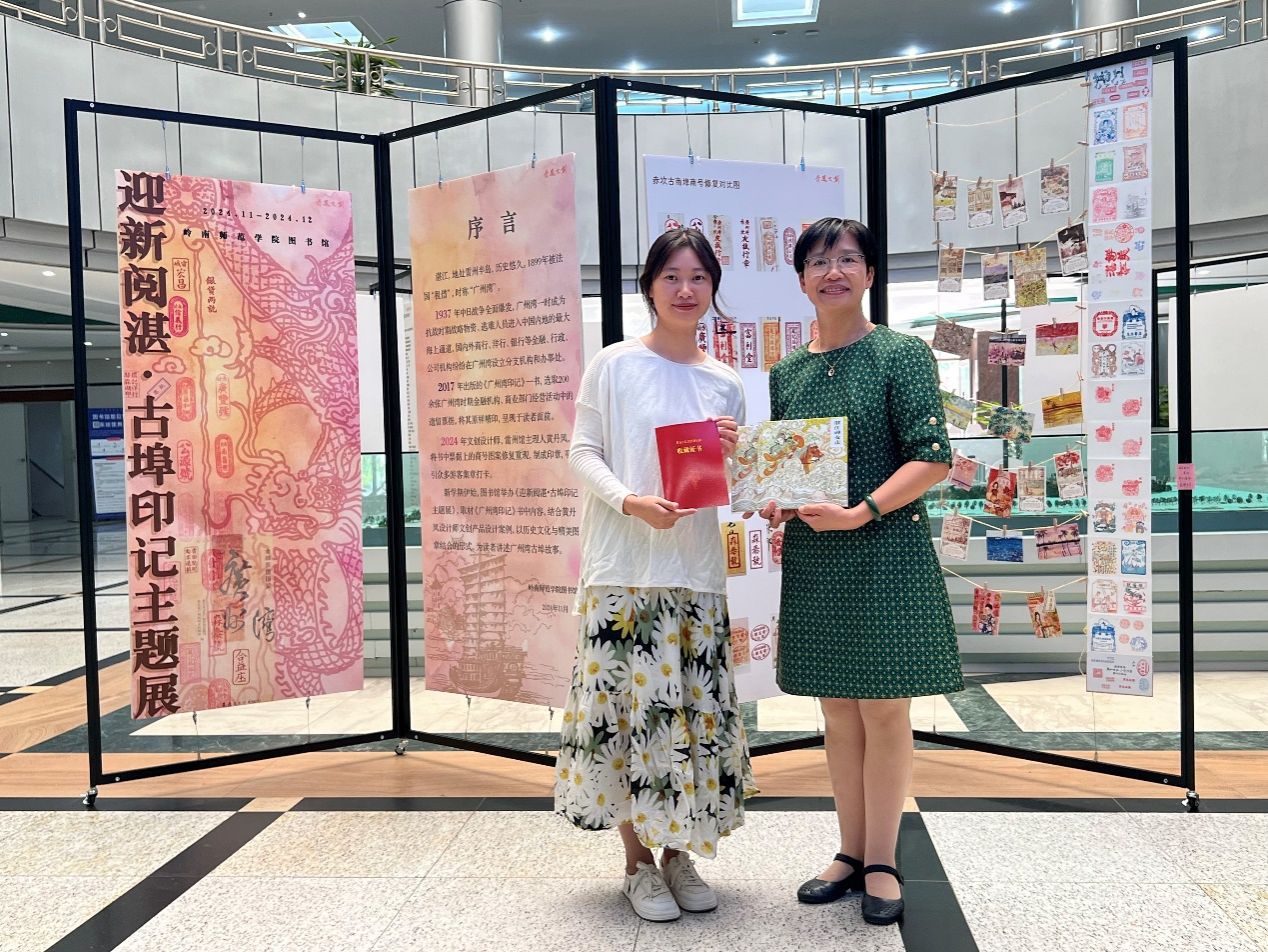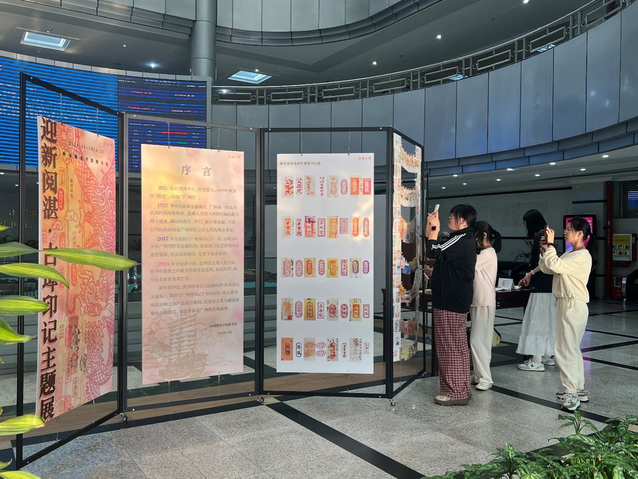 为了更加立体地搭建此次沙龙活动,图书馆在开讲前一周就为此布置了相关的主题展《迎新阅湛 古埠印记》,展板内容由《广州湾印记》一书开启,结合湛江市赤坎区老街商会理事、雷州馆主理人黄丹凤的文创产品设计案例,融合历史文化与精美图章的形式,为读者讲述广州湾古埠故事;展板上特别设有“贴纸提问区”,以此提前收集读者问题,促成沙龙的互动。另外,展区除了布置黄丹凤的部分文创产品实物外,还摆放了《广州湾印记》、《湛江通史》、《雷州文化概论》等相关馆藏,展藏合一,以展促阅。