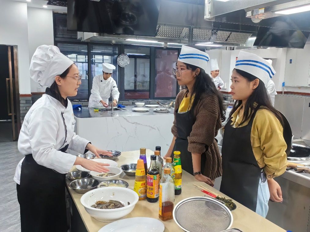 泰国皇家理工大学交换项目师生来到湛江后还参观了赤坎老街、金沙湾、寸金公园等标志性景点,在我校粤菜工坊一起体验制作粤菜茶香虾、芝士黄金虾。泰国交换生彩虹说到:“茶香虾的制作过程非常考究,复杂的制作过程最终呈现在虾鲜香的味道中,她很喜欢粤菜,期待在接下来的两个月时间里掌握更多粤菜的制作方法。”