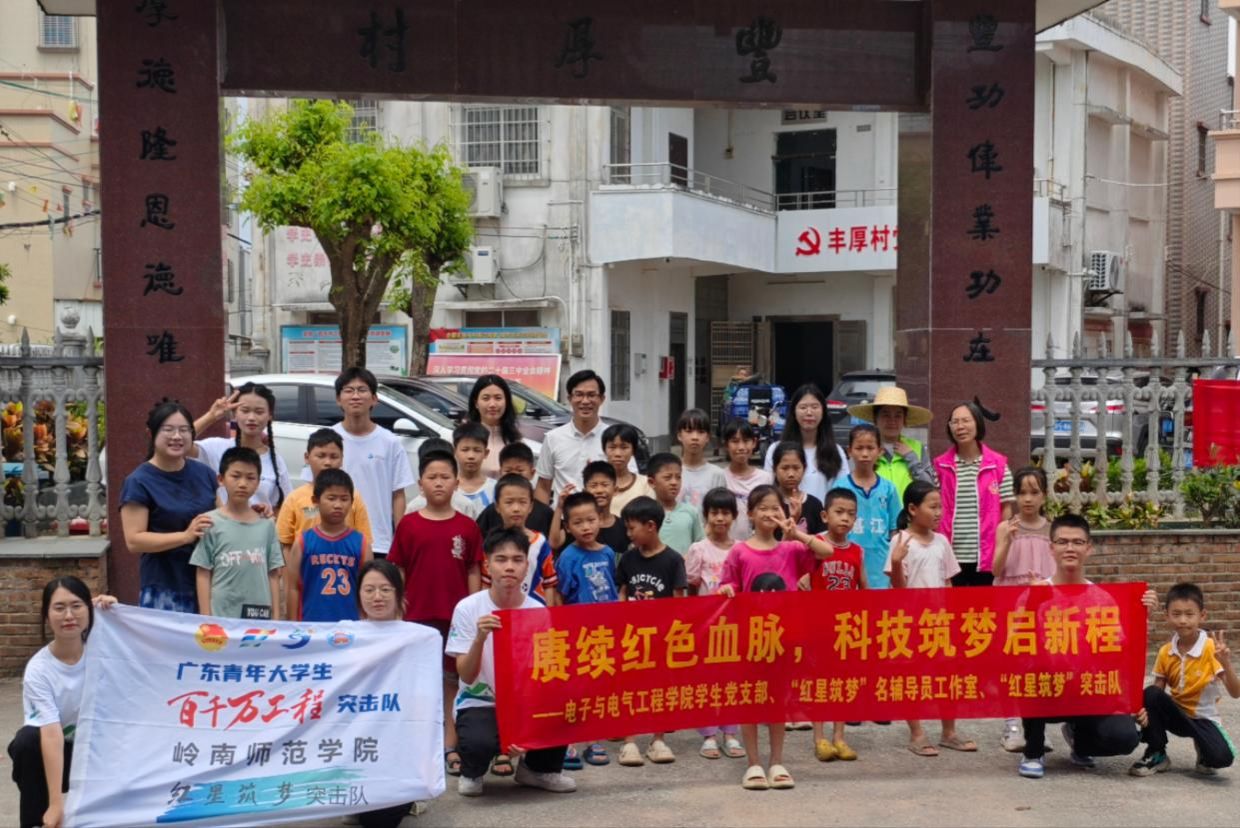 7月4日,电子与电气工程学院学生党支部、“红星筑梦” 名辅导员工作室与“红星筑梦”突击队在湛江市赤坎区北桥街道丰厚村开展“红星筑梦”科技赋能活动,为乡村儿童带来别样科学体验,电子与电气工程学院党委副书记陈海东、辅导员黄秋洁与周珂晴共赴奇妙科学之旅。