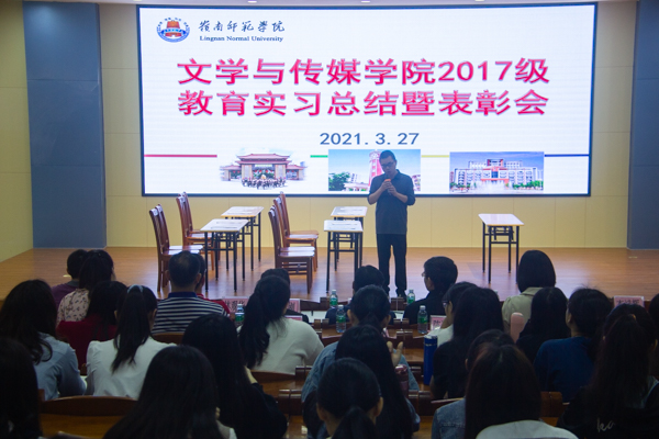 3月27日上午,文学与传媒学院在弘雷楼511教室举行了2017级教育实习总结表彰会。学校教务处领导、文传学院领导和部分老师、来自广州、佛山和湛江8所实习学校的领导、校友代表、该院2017级师范专业学生和部分2018级学生参加了会议。总结表彰会由学院副院长李斌辉教授主持。