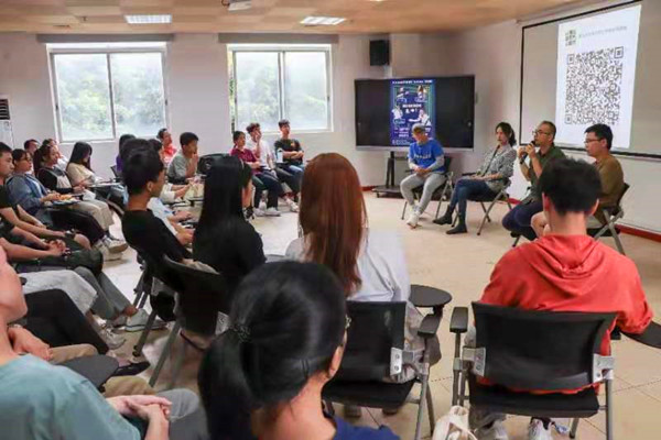 接着,俱乐部的演员小乐、韩钧、老王分别作了精彩的脱口秀表演,他们生动的表演和贴近大学生的学习、生活的段子,引起同学们的强烈共鸣,现场笑声不断、掌声不断。在互动交流环节,同学们踊跃提问,探讨怎样讲好脱口秀、在生活中如何发现有趣的素材、如何形成独特的脱口秀风格等,几位脱口秀演员根据切身感受耐心地作出了解答。