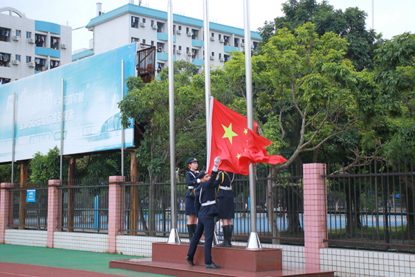 升旗仪式于7点05分准时开始。在全体师生的注目下,英姿飒爽的国旗护卫队精神抖擞地踏着正步,护送鲜艳的五星红旗进场,点燃了在场师生满腔炽热的爱国之情。行礼完毕,伴随着庄严嘹亮的国歌声,五星红旗冉冉升起,全体师生凝视着迎风飘扬的五星红旗,表达了对祖国无限的热爱和崇高的敬意。