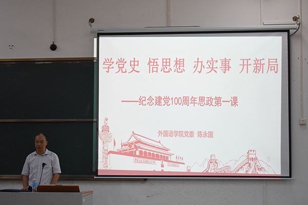 4月16日晚上,外国语学院党委陈永国书记在教三611室举行了2021年春季新学期思政第一课,此次课程的目的是贯彻落实习近平总书记在党史学习教育动员大会上的重要讲话精神。讲座由外国语学院党委副书记杨建伟主持。外国语学院学生党员、入党发展对象、入党积极分子、各班班长和团支书以及所有学生社团负责人参加了讲座。
