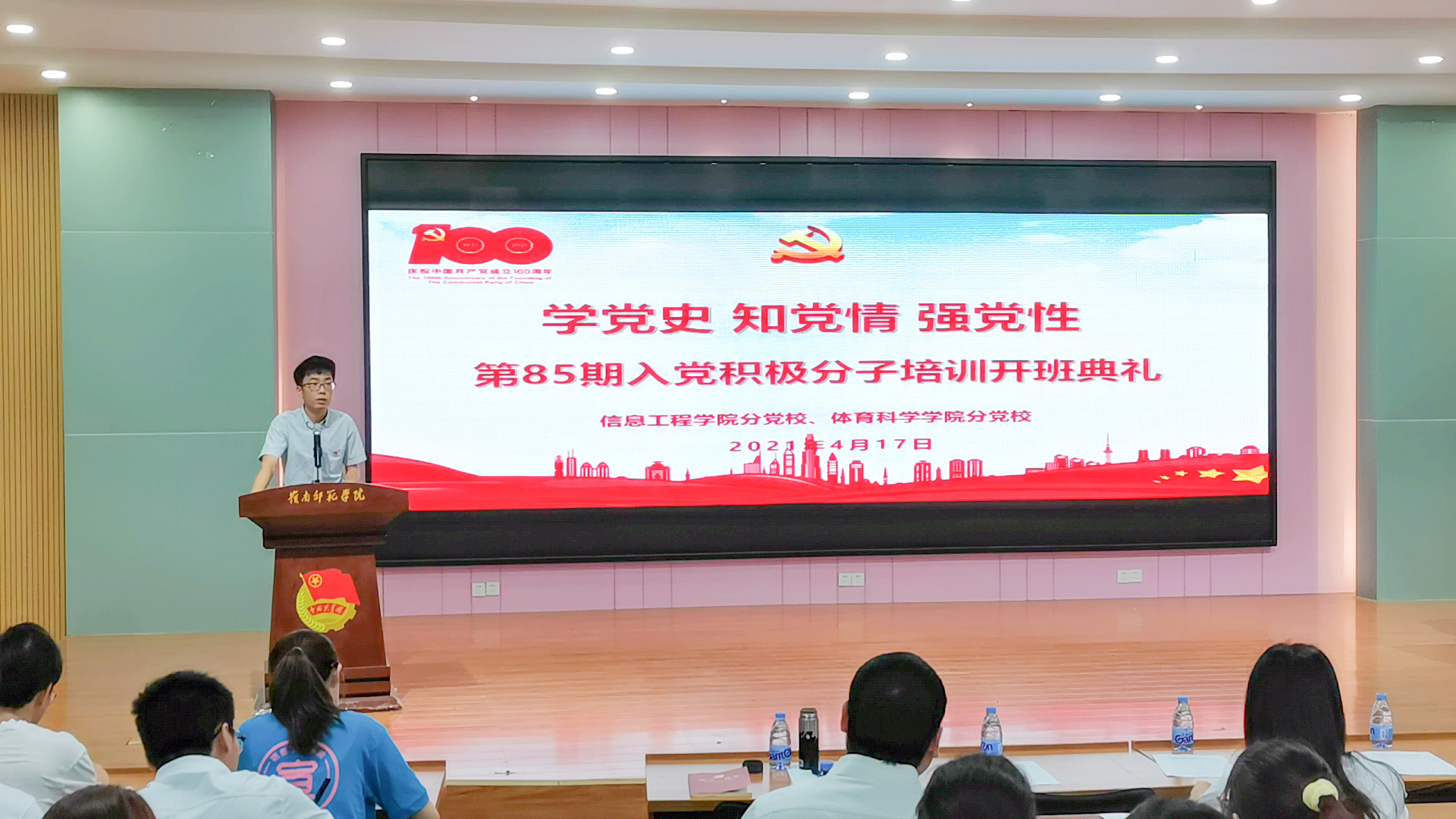 为深入学习贯彻习近平新时代中国特色社会主义思想,进一步提高入党积极分子的思想政治素质和政治理论水平,教育引导大学生入党积极分子端正入党动机,增强执行党在新时代的路线、方针、政策的自觉性和能力,激发同学们的爱党爱国情怀,4月17日上午,信息工程学院分党校、体育科学学院分党校联合举办的第85期入党积极分子培训班开班仪式暨“学党史,知党情,强党性”主题教育活动在教三211会议室隆重举行,信息工程学院党委书记、信息工程学院分党校校长李海文委托信息工程学院组织员发表动员讲话。本期307名入党积极分子共同参加开班仪式,开班仪式由信息工程学院组织员刘利丹主持。