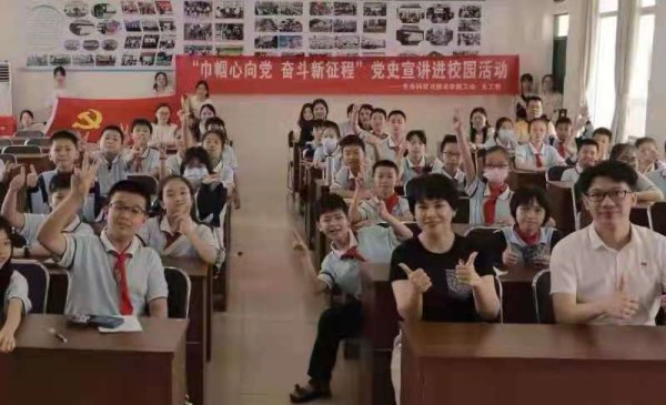 覃静君用生动详实的语言,深入浅出,带领同学们穿越时空隧道,重温了中国共产党的光辉历程。她先以党旗为切入点,向同学们娓娓道来中国共产党诞生的过程,再从刘胡兰从容就义、放牛娃王二小勇于牺牲、董存瑞舍身炸碉堡、黄继光用胸膛堵住敌人枪口等可歌可泣的英雄故事中汲取前进的力量,带领同学们重回那个浴血奋战、顽强不息的光荣年代,赓续红色血脉。她还向同学们悉数新中国成立后,中国共产党带领中国人民取得的举世瞩目成就,引导学生牢记先辈的谆谆教导,从学习百年党史中,传承革命精神,引导学生厚植“知史爱党、知史爱国”,树立崇高的信念,为中华之崛起而读书!