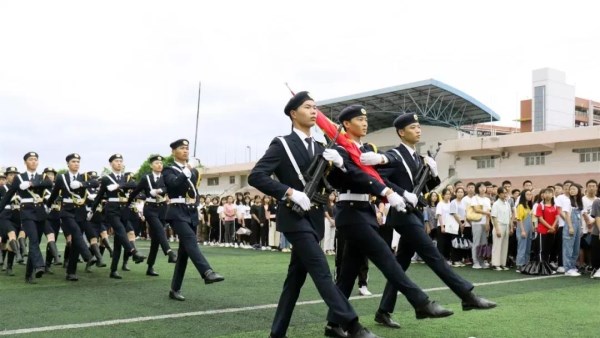 学校国旗护卫队迈着整齐、铿锵有力的步伐,庄严护送五星红旗进场。伴随着国歌响起,现场全体师生庄严肃立,面向国旗行注目礼,升旗手将国旗奋力一抛,五星红旗冉冉升起。