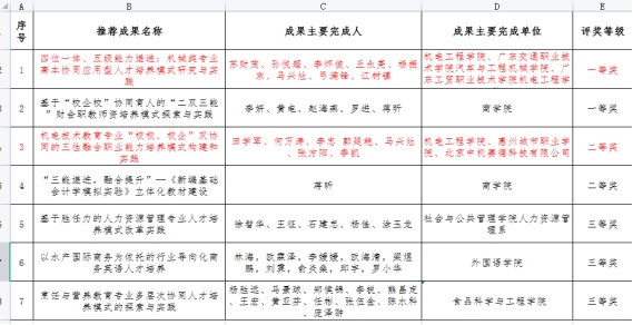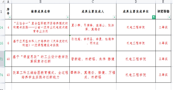 2021年度,机电学院获得校级教学成果奖6项,高等教育类4项:“三性合一”复合型职教师资培养模式的构建与实践----以省一流专业机电技术教育专业为例、基于应用型本科人才培养的《汽车发动机构造》一流课程建设与实践2项成果获得二等奖,基于“课堂思政”的工业设计教学改革探索与创新、改革工科三维绘图教育模式,全过程培养学生实践与创新能力2项成果获得三等奖;职业教育类2项:四位一体、五级能力递进:机械类专业高本协同应用型人才培养模式研究与实践成果获得一等奖,机电技术教育专业“校校、校企”双协同的三性融合职业能力培养模式构建和实践成果获得二等奖。恭喜获奖的老师和团队。