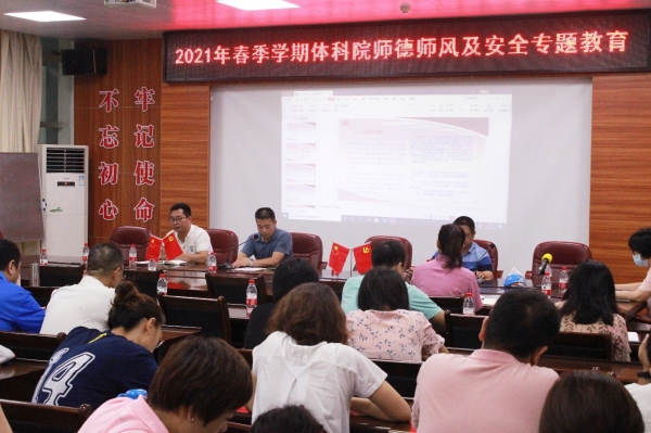 教师发展,师德为先。为进一步推进体育科学学院师德师风建设工作,打造作风过硬、师德高尚的教师队伍,树立严格自律、爱岗敬业、为人师表的良好教师形象,体科院于5月12日下午在会议室召开“师德师风及安全主题教育”主题教育会议。体科院全体教师出席本次会议,体科院党委书记邱飞主持本次专题教育学习会议。