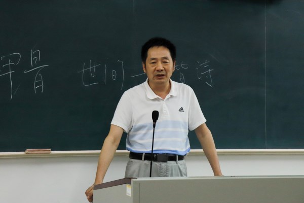 在于坚从三个方面论述完讲座主题后,现场进行了问答互动。一位女同学表示自己在于坚第四届鲁迅文学奖的获奖作品《只有大海苍茫如幕》中看到了“人的生命与大海‘变与不变’的关系”,问于坚正确与否?于坚回答道:“诗的美在于不确定性,你看到的诗是怎样的,就是你心中的答案。”另一位男同学向于坚提出问题:“诗的语言究竟是怎样的?它是情感的流露、词句的组合还是语言的魅力?”于坚侃侃而谈——诗的语言无绝对的标准,一首诗是否合格在于它能否“招魂”,诗是被用来理解与热爱生活的,而非固化的创作模式。当被问及“如何看待‘诗与远方’的含义时”,于坚转身在黑板上题下了一句话:“世间一切皆诗”,凝练精简地直击问题答案的核心。