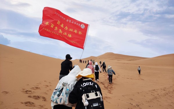 队员们在毛乌素沙漠地区徒步二十公里,驱车横穿阿拉善沙漠。在腾格里沙漠,虽然狂风裹沙扑打行进的队伍,在险峻坡面匍匐前进,但是没有任何成员轻言放弃,最后成功登顶海拔数百米的沙丘。在途中,来自华南师大的李保生教授和岭师地科院的牛东风副教授,为同学们详细介绍沙漠的形成、分布和草方格沙障防沙治沙的技术,使同学们对沙漠环境和治理有了一个直观、系统的了解。同时,李教授为同学们讲述在沙漠研究领域前人的科研励志故事,鼓励同学们要不畏艰难、务实求真、勇敢创新,立远大志向,成国家社会有用之才。