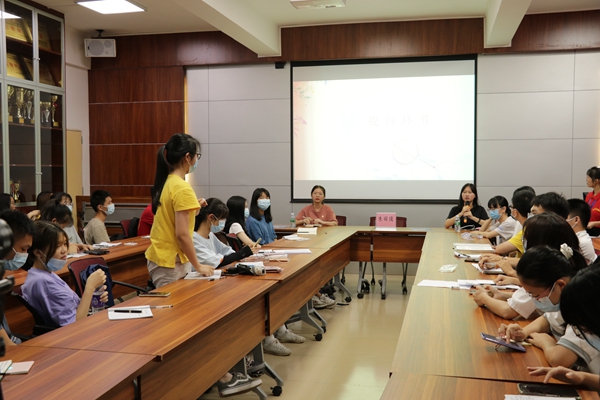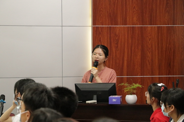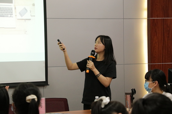 黎欢娴对前期相关资料的准备作详细讲解。她从四个部分展开讲解,分别是策划书撰写、队员分工安排、课程表设置以及注意事项说明。黎欢娴以自己所在队伍为例,分享了自己的相关资料准备工作的经验,增进了各实践队代表对于各类需要上交材料的了解。