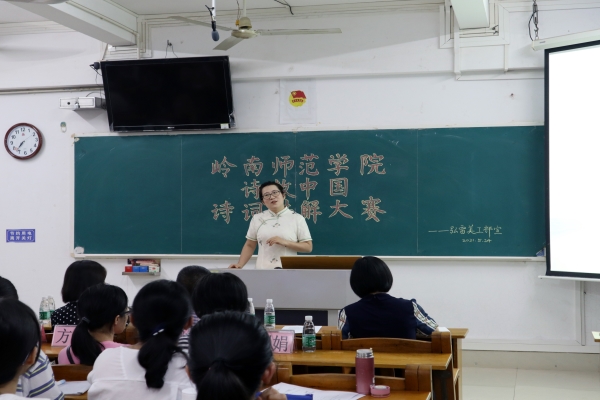 为传承中华优秀传统文化,深入挖掘中华经典诗词中所蕴含的民族正气、爱国情怀、道德品质和艺术魅力,引领诗词教育发展,弘扬伟大建党精神,文传学院于5月24日晚在弘雷楼510教室参加本次大赛校赛初赛。出席本次比赛的嘉宾有文学与传媒学院院长阎开振、党委副书记梁碧斐、副院长朱习文、陈晓清老师、方隽老师、何丽娜老师、刘娟老师以及本次比赛的评委老师李斌辉副院长、马显彬老师、罗婵媛老师