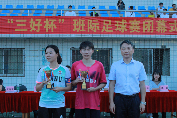 在体育科学学院学生联合会的组织策划下,5月30日下午体育科学学院第十八届“三好杯”班际足球赛正式落下帷幕。参加本次闭幕式的有体科院副院长王海涛(主持)、党委副书记屈云、运科系主任刘玉倩、裁判长杨国柱老师、辅导员乔志老师以及各二级学院嘉宾与观众共同观赛。