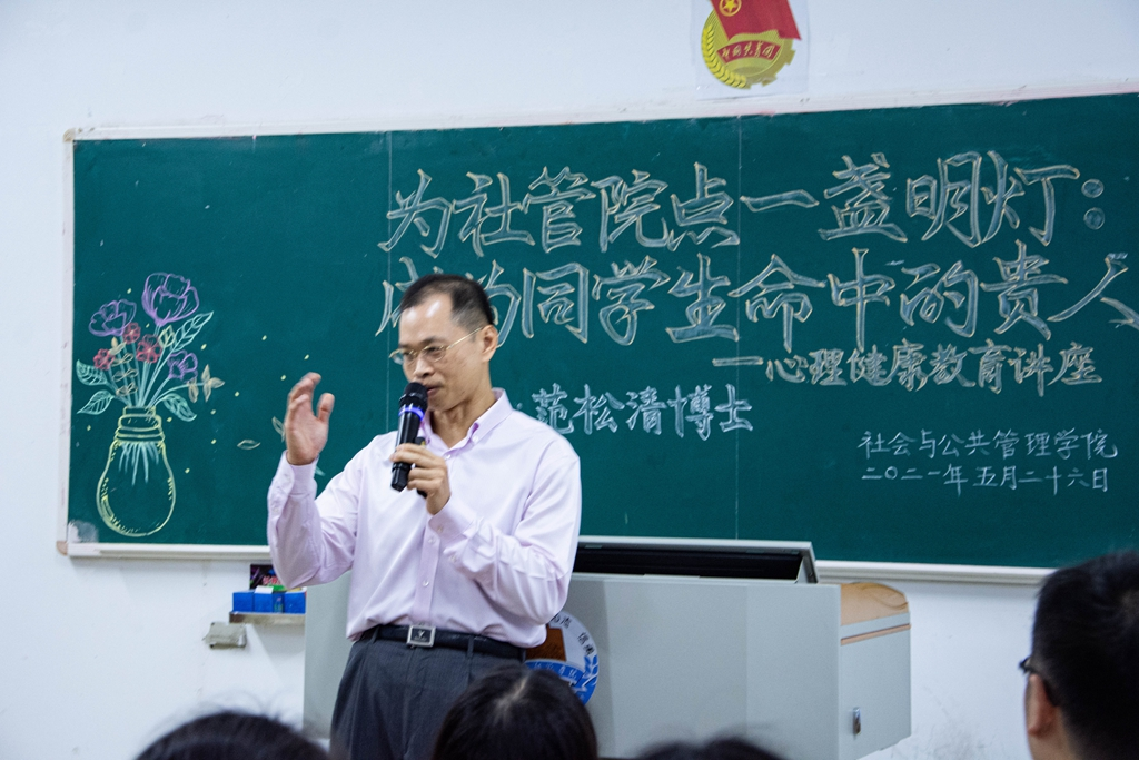 5月26日晚,社管学院特邀国际nlp专业执行师、国际usui reiki ryoho灵气治疗师、我院副教授范松清老师于弘雷楼207室举办以“为社管院点一盏明灯,成为同学生命中的贵人”为主题的心理健康教育讲座。专业课教师代表、班主任代表、全体心理委员、宿舍舍长参加。讲座由黄剑副院长主持。