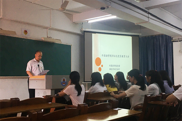 6月16日,外国语学院于教三608室召开“外国语学院2021届毕业生党员教育大会”。出席会议的人员有外国语学院党委书记陈永国,组织员老师陈韵桥以及2017级全体在校毕业生党员。