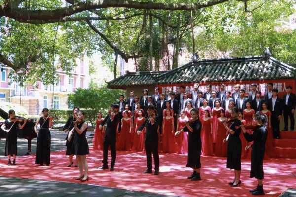 “我和我的祖国,一刻也不能分割……”悠扬的琴声在古榕广场响起,一曲小提琴重奏《我和我的祖国》勾勒出锦绣山河,家国情怀伴随阵阵琴声流淌进观众心中;合唱《赞美祖国》《追寻》《没有共产党就没有新中国》用嘹亮的歌声和饱满的激情表达对党和国家的无限忠诚和深情祝福,诉说对党和祖国的深厚热爱与依恋之情;朗诵《中华颂》慷慨激昂,感人肺腑,青年学子庄严承诺要坚定理想信念、矢志不渝跟党走,不断汲取奋进力量,淬炼红色信仰;一曲《歌唱祖国》的旋律响起,伴随着悠扬的音乐,学校领导缓缓上前领唱,经典的旋律、脍炙人口的歌词,感染着全场观众纷纷拿起手中的党旗和国旗尽情挥舞,引吭高歌,唱出浓浓爱党情,向伟大的中国共产党百岁华诞献礼。