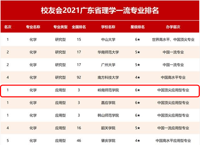 近日,由全国第三方大学评价机构艾瑞深校友会网独家撰写,科学出版社正式出版的2021校友会中国一流专业排行榜公布,岭南师范学院化学化工学院化学专业和制药工程专业成功入选一流专业排行榜。