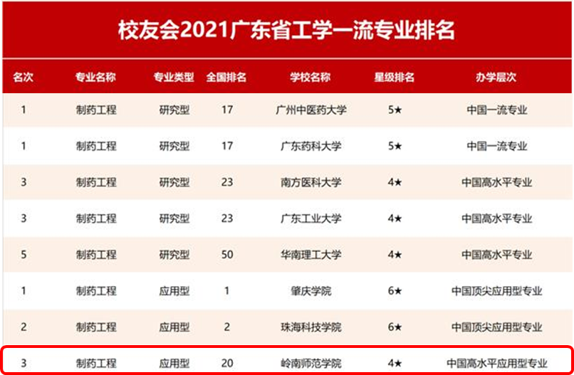 排名显示,岭南师范学院化学专业在中国理学类一流专业排名中,并列全国应用型化学专业第三名,为6星级广东省应用型化学专业第一名,办学层次为中国顶尖应用型专业。制药工程专业在中国工学类一流专业排名中,并列全国应用型制药工程专业第20名,为4星级广东省应用型制药工程专业第三名,办学层次为中国高水平应用型专业。