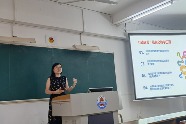 陈婷以《慕课建设与启发》为题做了讲座,分享了她在华南师范大学未来教育研究中心的访学成果。陈老师先用腾讯文档进行问卷调查,老师们通过现场答题感受协同编辑和实时收集统计意见的功能。这学期她布置了每周演讲,现场展示了如何教学生在腾讯文档预约演讲时间并提交演讲稿到云端,师生随时可以调取查阅,避免了忘带优盘保存课件到课堂的尴尬。所有同学都需对其他同学提交的演讲稿进行互评,教师通过历史可以查阅点评记录。陈婷老师还汇报了访学期间所参加的学术活动:旁听硕博课程,参加各类国内国外学术会议,参与导师的慕课建设。通过亲身参与慕课建设,她深入了解了慕课制作的具体流程:大纲讲稿准备—课程设计—样片制作—正式拍摄—后期制作—课程上线等一系列的步骤。本学期陈老师在自己的班级尝试使用南方医科大学陈泽璇副教授的慕课《互联网+大学英语》辅助授课,里面有非常系统的四级复习方法,涵盖听说读写译各个方面,学生也反映学习效果不错。最后,陈老师介绍了《外语教育技术》这门慕课和《信息化教学创新》公众号,便于大家追踪热点前沿。对于学生,她也推介了实用的英语学习工具,灯塔分级阅读、flax library、必应搜索等,激发学生学习兴趣和提高学习效率。