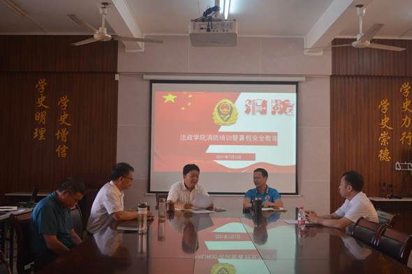 7月2日,学院办公室参加完学校举办消防安全员培训后,专门向学院党政班子作了汇报,领导高度重视,7月3日召开党政联席会议,部署学院的消防培训和暑假安全教育方案,结合期末工作实际,及时转发了消防警示视频和培训课件,第一时间要求师生观看学习,组织思政、历史、法学各专业和学工进行培训和观看消防安全警示教育。7月9日下午,学院结合《学党史悟思想,谋新局促发展——法政学院2021年学科专业建设研讨会》时机,再组织培训教育。学工办针对暑假安全问题,专门制作消防和假期安全防范的宣传推文。7月5日,学院在李德深书记、刘鑫淼院长的带领下,组织安全工作小组成员对学院管辖的办公室、实训(验)室、档案室、资料室等场所进行了安全隐患排查整治,并严格按照学校要求,由各分管领导、办公室、各专业系、党支部负责各自人员、财物等安全,全面落实主体责任。