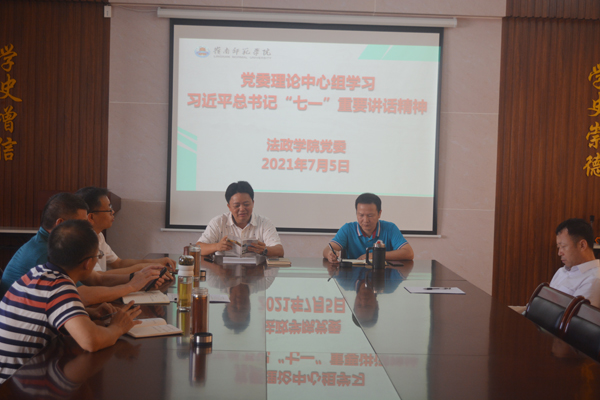 7月5日,法政学院党委理论学习中心组召开集中学习会,学习贯彻习近平总书记在庆祝中国共产党成立100周年大会上的重要讲话精神。