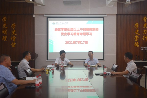 为贯彻落实学校《关于抓好暑假期间党史学习教育的通知》精神,法政学院党委按照学校统一部署和学院处级以上干部暑假期间党史学习教育专题学习计划。7月17日,组织学院党委成员和处级干部,在学院会议室,进行党史学习教育专题学习会和组织生活会。会议由李德深书记主持。