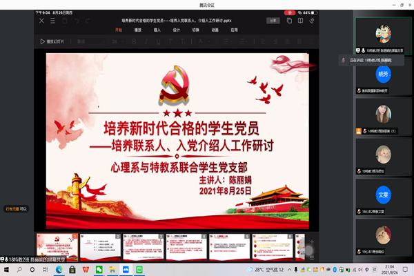 8月26日晚,教科院心理系与特殊教育系联合学生党支部举办主题为“培养新时代合格的学生党员——培养联系人、入党介绍人工作研讨”的2021年第14期生涯教育工作坊,此次工作坊由教科院心理系与特殊教育系联合学生党支部书记苏贵、学生党员陈丽娟、陈丽爽主讲,党支部副书记陈丽爽主持,党支部入党培养联系人、入党介绍人、预备党员共同参与本次工作坊的研讨学习。