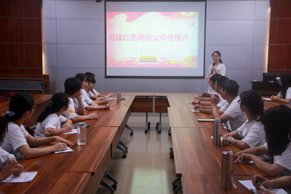 敖文雯进行党建红色网站、公众号推介。她分别介绍了共产党员网、中国共产党新闻网、红色文化网、共产党员、党史学习教育、广东党史等网站和公众号。她建议学生党员们可以通过这些平台查找资源、检索数据库和了解新闻时事。张家源对国家级期刊、省部级别期刊、核心期刊、其他期刊等党建红色期刊进行了经典文章文段的推荐与分享。他认为,学习期刊的意义在于提高政治素养,学习精神内涵,有助于进一步做好高校学生党建工作。学生党员则应深化理论学习,自主学习、阅读期刊,提高自身的理论素养和时事认识。