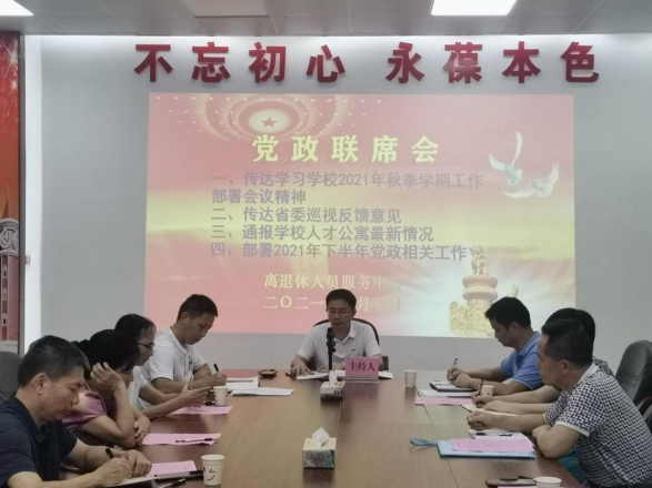 根据学校2021年秋季学期工作部署安排,结合离退休工作实际,9月7日下午,离退休人员服务中心召开党政联席会议,由党委书记、主任欧海清主持,离退休党委委员、支部委员、片区长和工作人员近30人出席了会议。
