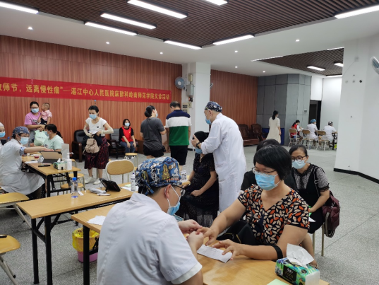 活动现场,人头攒动,前来参检的教师络绎不绝,义诊专家主要针对教师讲课站立时间长、说话时间长及伏案时间多、工作压力大等特点,提供多种慢性疼痛如头痛、颈肩疼痛、肩周炎、鼠标手、妈妈手、网球肘以及三叉神经痛、带状孢疹后遗神经痛等慢性疼痛的免费咨询、诊断、治疗及预防和康复,同时提供麻醉相关问题的咨询,如无痛分娩、无痛胃肠镜等舒适化医疗技术的科普和咨询等。