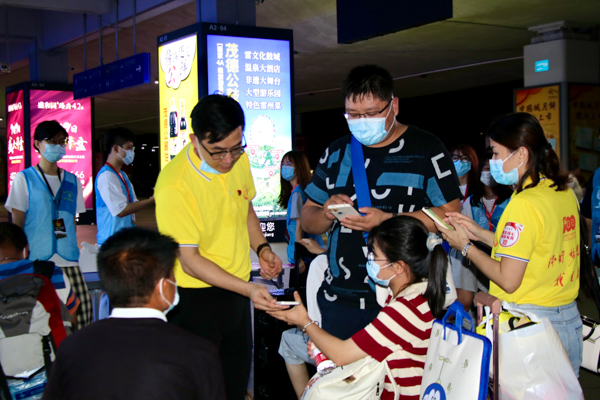 当第一缕阳光照射在湛江西站的地面时,凌晨迎新的志愿者登上了返校的大巴,新一批的志愿者再次接过迎新工作的接力棒。