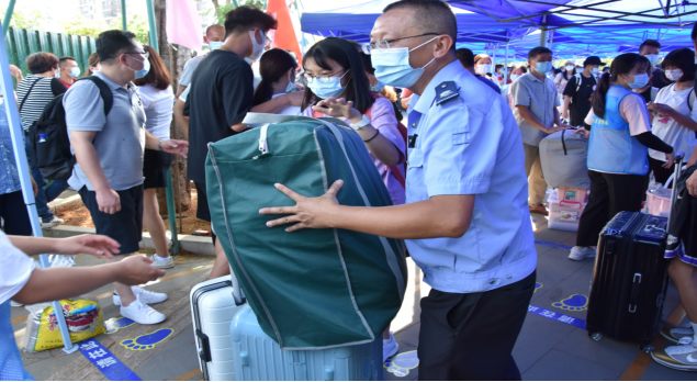 9月11日清晨,2021年迎新工作正式拉开序幕,安保处负责人第一时间亲赴一线、靠前指挥、现场督战。全体保卫干部下沉到校园各门岗一线,合理分工,责任到人,与全体校卫队员一起以饱满的工作状态迎接新生的到来。为做好疫情防控,避免校园内人员过多,安保人员耐心向新生家长解释不能陪同入校的相关防疫措施,得到了家长的谅解。入校通道处,安保人员认真检查新生手机入校验证页面,测量体温,在保证无异常的情况下引导新生有序进校。