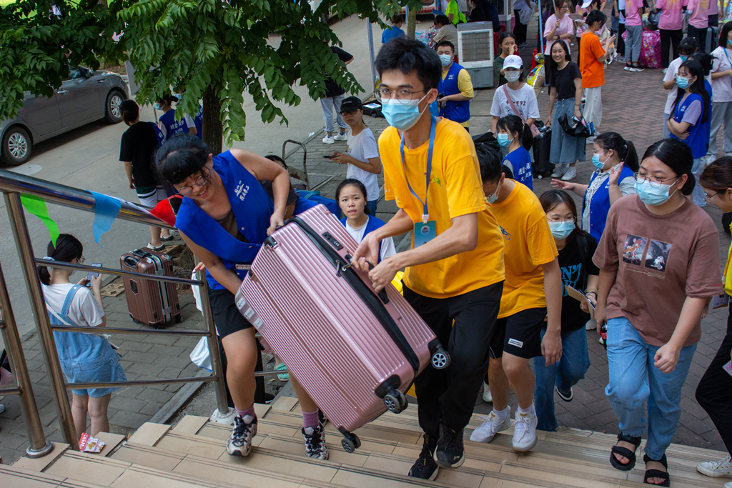 接过你的行囊,我们就是一家人。为了更加顺利地迎接新生的到来,法政学院的干部和志愿者们总是很早就在工作岗位上等候,看到一辆又一辆过往的车,总是迅速冲上前、停留、等待,在新生下车后,就积极接过他们的行李,引导他们进行入学报到。高温酷暑也无法消散学生干部与志愿者们的热情。他们是新生的帮助者,他们也是校园里移动的指向标,渐渐地就拉近了新生与陌生校园环境的距离,让他们深切地感受到了大学校园的热情与温暖。
