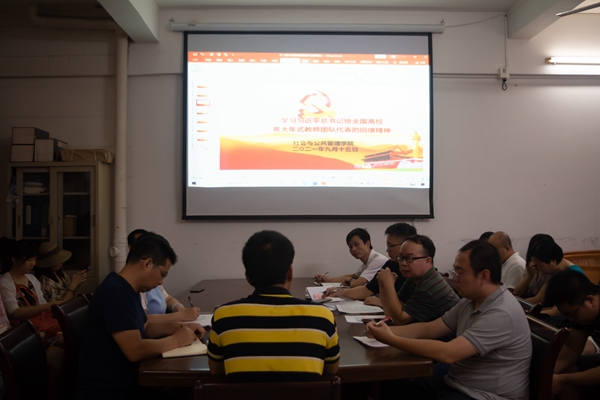 9月15日,社管学院于弘雷楼302室开展 “赓续百年初心,担当育人使命”师德巡讲活动。社管学院领导班子及全体教职工出席活动,活动由张勇副院长(主持行政全面工作)主持,学校第七届师德先进个人王征老师做师德专题巡讲。