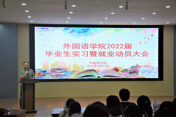 9月22日晚,外国语学院在教三511教室举行了2022届毕业生实习暨就业动员大会,会议由外国语学院党委副书记杨建伟主持。外国语学院党委书记陈永国、主持全面行政工作的吴晓春副院长、曹耀萍副院长、英语系主任古永辉老师和实习指导老师参加了会议。