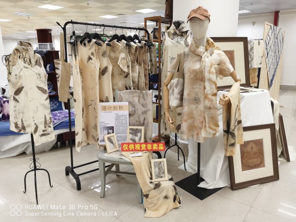 谭永定介绍,桉树叶具有疏风清热、解毒消炎、杀虫止痒的功效,每次经过桉树林,看见掉落土地上的桉树叶子色彩美丽,就想到了通过“非遗”扎染技术让桉树叶的色彩和各种生动的叶子形态留在布料上。她带领学生经过反复煮、染、蒸等的染色尝试和探索,终于把桉树叶暖灰色系肌理印在布料上,脉络丰富、形态素雅,耐人寻味。