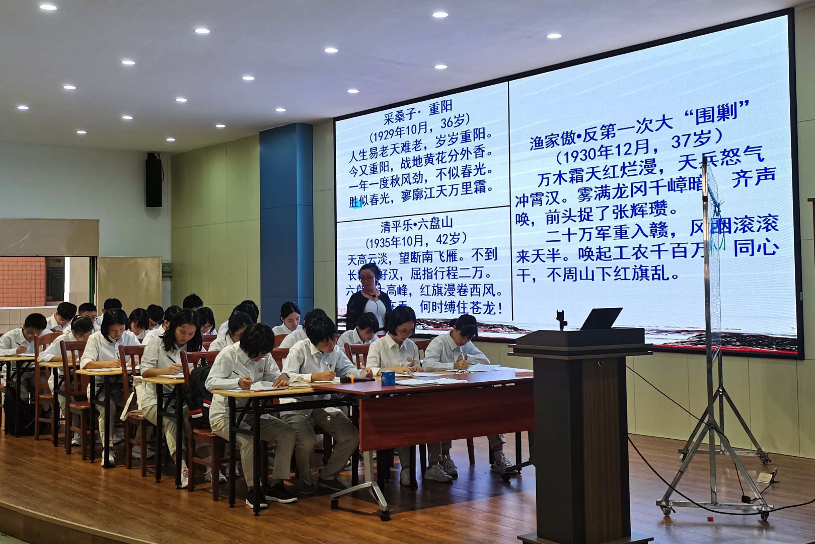 张卫娜老师以“乐观字词间,豪气冲云霄,从炼字看毛泽东诗词的审美意蕴”为主题,以《沁园春·长沙》为例,通过“自主学习”和“小组合作”相结合的方式,从炼字的角度入手,通过比较得出关键字词的方法,探究毛泽东诗歌的丰富意蕴,学习了解毛泽东诗词中选词用字的巧妙之处。