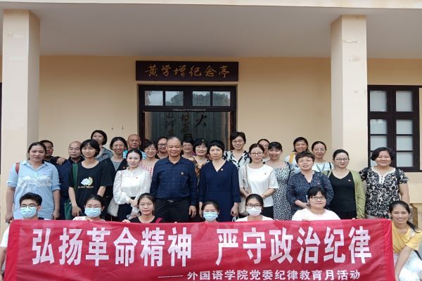 10月15日下午,外国语学院党委组织师生党员、入党积极分子和部分机构学生干部代表前往遂溪县乐民镇墩文村的黄学增烈士故居,开展主题为“弘扬革命精神,严守政治纪律”的党史学习教育,共同缅怀革命先烈,重温入党誓词,弘扬革命精神,加强党性历练,强化师德师风,凝聚奋进力量。