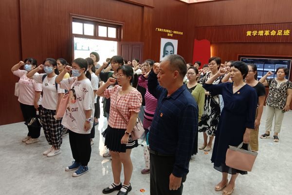 在黄学增烈士纪念亭内,怀着虔诚与敬意,师生们瞻仰黄学增烈士铜像并向铜像三鞠躬,师生从革命足迹的视频中重温黄学增同志短暂而辉煌的一生,了解纪念亭的由来以及周恩来总理与黄学增烈士之间深厚的革命友谊,深切感悟黄学增对于革命理想的执着追求。随后,陈永国带领师生党员面向鲜红党旗,举起右手,紧握拳头,重温入党誓词。