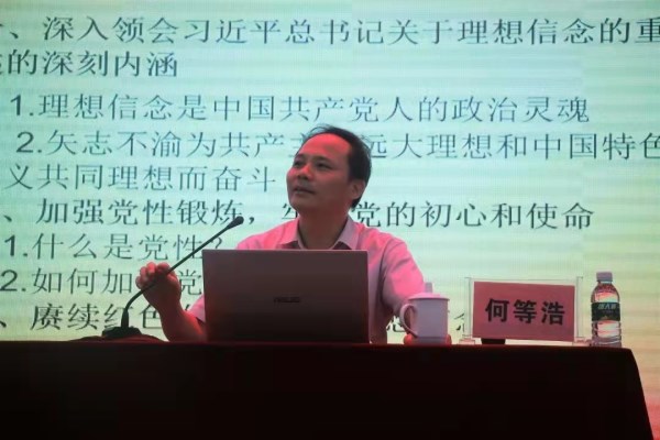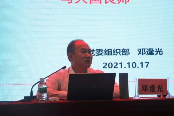 邓逢光以“习近平总书记关于教育的重要论述与大国良师”为主题进行授课。他以小学与大学思想教育的区别为引入,向与会人员强调了理想信念的重要性。他指出,共产党员应学深、学透习近平新时代中国特色社会主义思想,进一步增强“四个意识”、坚定“四个自信”、做到“两个维护”。他希望,新党员不仅要思想过硬,也要能力过硬,本事过硬,同时,要积极融入社会实践,为同学服务,在服务中锻炼组织协调与沟通能力。